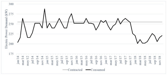 From Figure 3, it is possible to see that, over the last five years, the consumer unit exceeded the contracted power demand in some months, and in most of them, it did not use the contracted value of 255 kW. In 2014 and 2016, consumption was exceeded in just two months, while in the other months, there was a loss of contracted power demand. In 2015, there were three overtaking. It was in 2017 when most overtaking occurred, totaling five months. On the other hand, during 2018, the consumer unit paid for a much higher demand than used. This shows a lack of reconciliation between production planning and energy planning. Two overruns in the contracted demand generated a fine, causing losses to the company, highlighting the need to carry out this study.