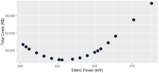 From the data collected, all the power demands measured from January 2014 to December 2018 were organized in a table (Appendix A, Table A2). From this, and with the help of Equation (3), it was possible to obtain the total costs of each value and, consequently, define the best among them, as shown in Figure 4.