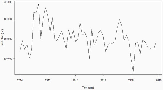 To prepare the production demand forecast, the historical data of the production of kg of potato were considered in the period of 60 months, from January 2014 to December 2018, given in Appendix A (Table A3). Therefore, the first step was to analyze the data profile surveyed to identify the components present, as shown in Figure 5.