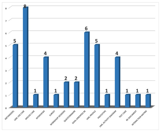 Considering the classification presented in Section 2, from the 24 primary studies obtained, the most applied techniques for RE were extracted. These were metamodels, UML use cases, misuse cases, interviews, surveys, workshop sessions, questionnaires, goal-oriented language, UML profiles, prototypes, UML activity diagrams, test cases, requirements specification documents, and interaction matrices.