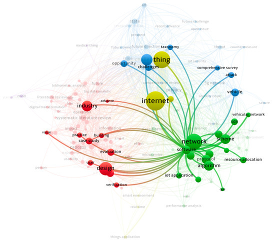A bibliometric analysis was carried out, considering the terms detailed in Table 1. These terms were used in the search strings applied in each data source in this SMS. The analysis was performed using Vosviewer (https://www.vosviewer.com accessed on 13 January 2022), which is a software designed to analyze scientific productivity during a period of time. Moreover, in order to identify trends in the literature regarding RE and IoT, an initial analysis of co-occurrences of keywords was performed, considering publications with a minimum of five incidences. This resulted in six clusters (see Figure 3), involving 68 keywords. The clusters were (1) internet, (2) thing, (3) network, (4) software, (5) design, and (6) challenges. Our analysis showed a weak relationship among the clusters regarding the terms internet, thing, network, and software, with the red zone corresponding to the clusters for design, evaluation, industry, and practice.