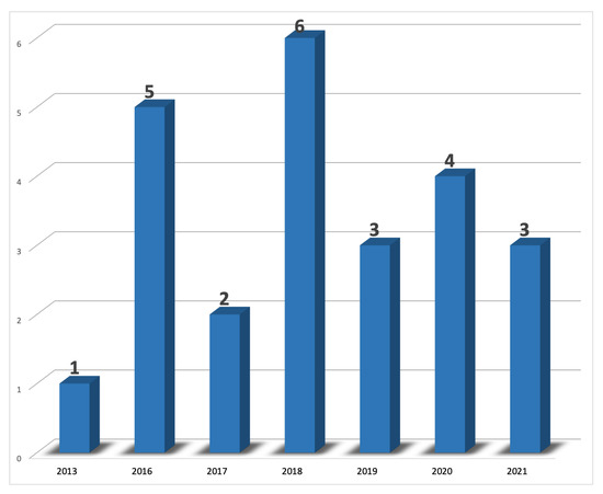 As IoT and RE both represent relatively new research fields, it is interesting to observe when articles on these topics were published. Furthermore, this is useful to identify when such themes were first studied and when the research on this direction expanded. Figure 4 illustrates the growth of the selected primary studies from this systematic mapping study over the years. It is possible to note that practically all studies (16 articles) were published in the last four years (no study was published before 2013), thus confirming that the integration of IoT and requirements engineering is a focus of current interest from the scientific community. This is despite the fact the COVID-19 pandemic affected different sectors of society, including academia, from 2020 to 2021. Furthermore, it is possible to note the increasing trend regarding the number of articles available in data sources through the years, indicating that more significant publications on this theme can be predicted for the coming years.