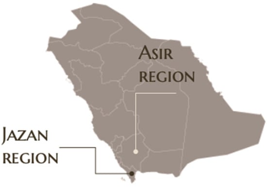 Thirty-seven and twenty-one honey samples were collected from the regions of Asir and Jazan, respectively (Figure 1). The Jazan area is approximately at sea level while the samples of the Asir region are from an altitude of 900 m above sea level. Jazan is characterized by the high temperature, high humidity and high barometric pressure compared to the Asir region.