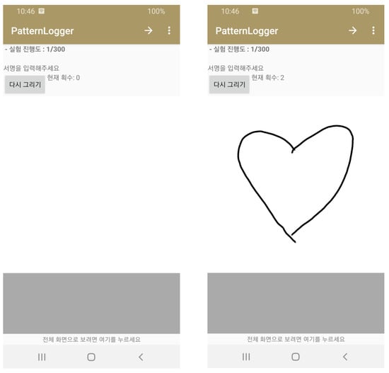 As illustrated in Figure 1, we collected the experimental data based on the developed Android-based data collector. The experiment involved 40 participants, each of whom, in a sitting position, drew 13 predefined patterns 20 times with both hands by using the Samsung Galaxy S8 smartphone. The parameters of the experimental environment are listed in Table 1. As presented in Table 2, the experimented drawing patterns comprised five English, five freestyle, and three Korean patterns.