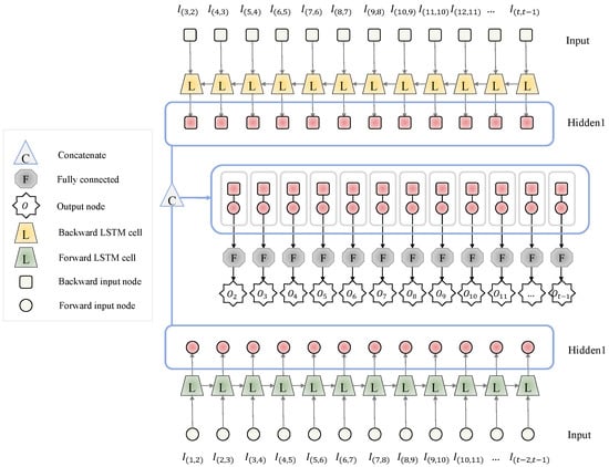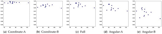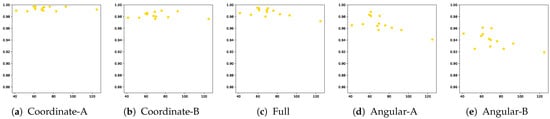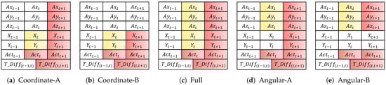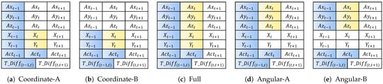 As presented in Table 6, we used five combinations of the variable set to investigate the effect of each variable category on authentication performance. To develop the sequential model, we used the following input variables: (i) past-to-previous-time variables, , , , X, and Y, and (ii) past-to-current-time variables, and . Then, we used the following output variables from the current time: , , , X, and Y. Figure 4 and Figure 5 depict the used variables based on the five combinations of the variable set for the forward and backward sequential structures, respectively. Coordinate-A/B, Angular-A/B, and full variable combination sets use the output variable coordinate-based feature (X,Y), angular velocity-based feature (, , ), and both, respectively.