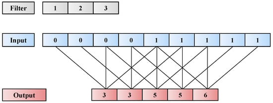 TCN has demonstrated excellent performance with sequential data in various studies [29]. Especially, it exhibited superior performance in sequence classification, such as vision, natural language processing (NLP), and music fields, in comparison with Vanilla RNN, gated recurrent unit, and long short-term memory (LSTM) [10]. In this study, we used dilated causal 1D convolution [30] for DDP to use the available information up to the current time. The 1D dilated causal convolution, which is computed by Equation (2), is illustrated in Figure 6, where s, d, and k denote 1D sequence input, dilation rate, and filter size, respectively. Furthermore, denotes the result of the convolution operation at time t.