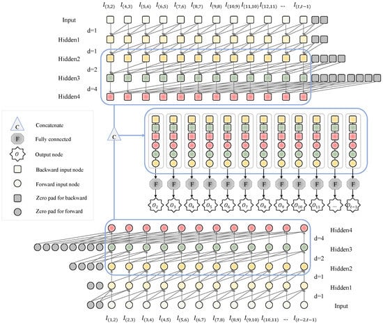 The proposed TCN-based DDP model is illustrated in Figure 7. If we use the FULL variable combination set, the variables input () and output () at time t for the forward structure are represented by Equations (3) and (4), respectively.