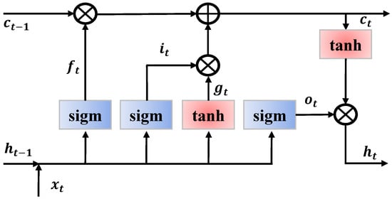 RNN has provided excellent performance in various sequential data applications, such as NLP, voice, and time-series signals [33]. In this study, we used a basic LSTM cell for the authentication model because its performance is the same as that of the other variants of the RNN cell [34]. The LSTM cell is illustrated in Figure 8, and Equations (5)–(10) provide the computation of each component in the figure. The line on the top denotes the cell state, which is the internal memory, whereas that on the bottom indicates the hidden state. We denote the cell and the hidden state by c and h, respectively. The input gate, i, forget gate, f, output gate, o, and internal hidden state, g, are the distinctive features of LSTM, and they are designed to prevent the vanishing gradient problem [35]. During training, the weights and bias in each gate are trained. The forget gate, , can control how much the previous hidden state, , should be preserved in the current state, whereas the input gate, , can control how much the current input, , should be reflected in the current state. The output gate, , regulates the amount of hidden state, , in the next sequence and the internal hidden state, , is calculated from the input, , and the previous hidden state .