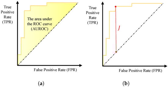 Two types of performance indices. (a) AUROC; (b) Youden index (J) by threshold.