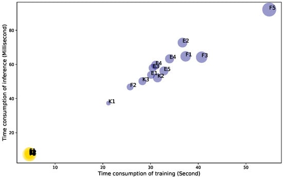 Training and inference time consumption for each length of each drawing pattern. Bubble size corresponds to the length of sequence. E, F, and K denote English, freestyle, and Korean patterns, respectively.