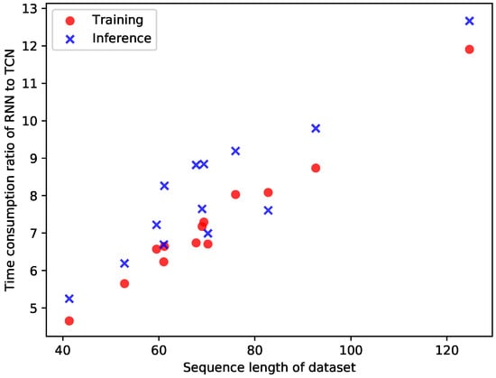 The bubble plot in Figure 13 illustrates the time consumption for different patterns. It can be observed that the processing time based on the TCN structure is not significantly affected by the pattern length; however, that based on the RNN structure is highly dependent on the pattern length—the longer the pattern, the longer the processing time. This independence on the patten length of TCN can be a significant advantage when an authentication algorithm is implemented in an edge device with an insufficient computational capacity. Figure 14 illustrates the time consumption ratio of RNN to TCN with respect to the average sequence length of a pattern. It is clearly seen that the processing time for RNN rapidly increases in comparison with that of TCN; therefore, the ratio on the y-axis increases when the pattern length increases.