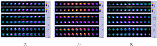 Moreover, in Figure 7 (ischemia–case B), the nuclear expert (N.P.) diagnosed hypo-perfusion, which was observed in the septum, in the inferior myocardial wall, as well as in a part of the apex—see slices 10–18 (row A), 29–35 (row A), and 30–36 (row A). As soon as the algorithm was applied, we observed that the above myocardial walls were marked with more intense yellow at post-stress in row A on all three axes regarding the same slices as prescribed by the expert in Figure 7a.