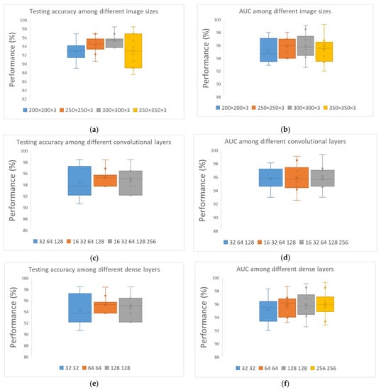 Convolutional neural network architecture for CAD classification problem comparing various values for all parameters: (a) Testing accuracy for different image sizes; (b) AUC for different image sizes; (c) testing accuracy for different convolutional layers; (d) AUC for different convolutional layers; (e) testing accuracy for different dense layers; and (f) AUC for different dense layers.