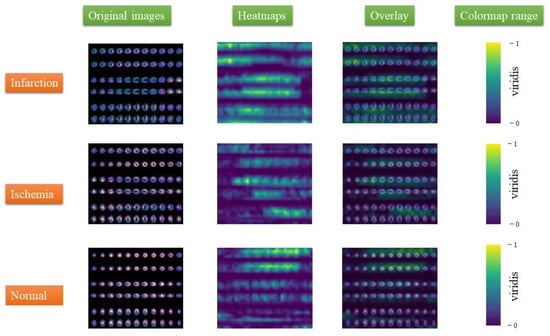 Figure 4 shows the visualization results produced by the Grad-CAM for each CAD category. Among them, we can distinguish the original images for each category, the heatmaps generated by the Grad-CAM method, and the visualization result generated by superimposing the original image on the heatmap. Different colors indicate the importance of pixels in the classification results, representing the sensitivity of the CNN-based classification model to each pixel. The colormap Viridis, which was obtained from the OpenCV library, was used.