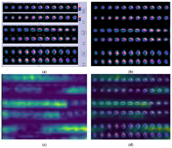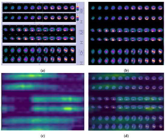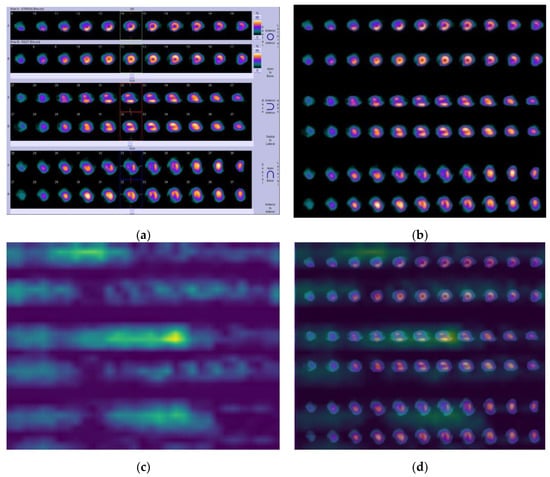 Case A. (a) Initial SPECT MPI image; (b) processed image; (c) produced heatmap; and (d) visualized image generated by Grad-CAM for infarction.