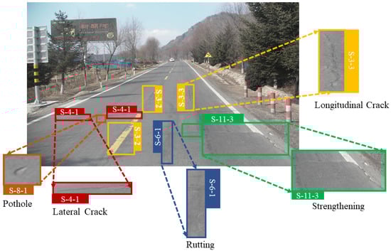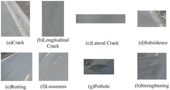 The G303 road segment in China is selected to collect road damage data at this time. Compared with other pavement, G303 has a large number of trucks/cars passing every day. Further, the temperature differences of this road segment are large across the four seasons. These problems lead to higher road damage density in collected single images, and road damage detection carried out on the dataset is more challenging. Ultimately, the dataset included 4319 images with 21,552 annotations. These pictures were uniformly captured using professional onboard cameras. All image are 1600 × 1200 pixels and wide-view perspective. According to the evaluation standard for highway technical conditions, the CNRDD provides eight types of damage labels, including crack, longitudinal crack, lateral crack, subsidence, rutting, looseness, pothole and strengthening. Visual examples of these types of damage are shown in Figure 2.