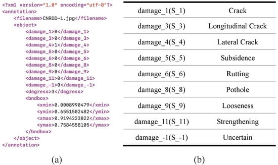 Description of road damage annotation. (a) Screenshot of annotation file. (b) Correspondence between classification codes and damage name.