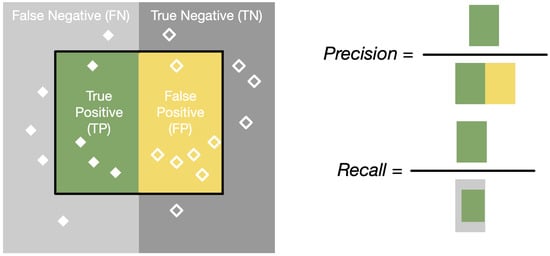 In Figure 4, each solid white diamond represents a positive sample, each hollow white diamond represents a negative sample, and diamonds in the black solid line represent the instances predicted as positive samples by the model. As shown in Figure 4, TP (green area) represents the positive samples predicted as positive samples, FP (yellow area) represents the negative samples predicted as positive samples, and FN (light grey area) represents the positive samples predicted as negative samples.