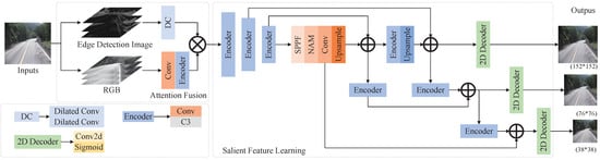 where indicates the feature map of edge detection, and represents the feature map of the RGB image. Softmax() refers to the calculation that can activate the attention of the feature map. After the fusion operation defined in Equation (4), the potential location information of damage in edge detection will enter the next module with fusion feature and will play a role in salient feature learning.