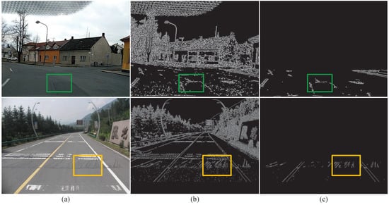 From Figure 6b,c, it can be seen that extracted edge information is more related to the damage location without the interference of other objects around the road. However, we also observe that edge detection of half images is a single-channel gray image with sparse effective pixels. In order to make it play a better role in attention guidance for feature learning, it is necessary to expand the range of the receptive field. Therefore, we used dilated convolution to design the DC block in Figure 5, which can learn the attention map of damage location according to edge detection.