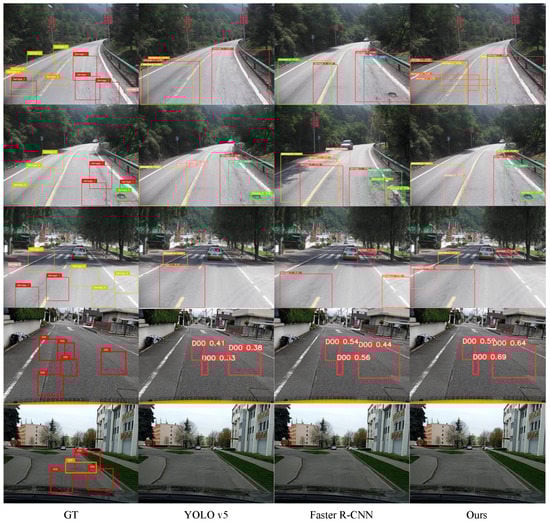 In addition to quantitative analysis, we also perform visualization analysis on different datasets. YOLO v5 [15], Faster R-CNN [12] and our proposed method are selected for comparison; the detection results are shown in Figure 7.