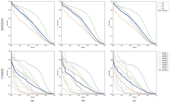 Precision–Recall curves from different methods. The data of (a–c) are from YOLO v5 [15], Faster R-CNN [12] and the proposed method, respectively. Different colors represent the detection results of different types of damage, and the corresponding relationship is shown in the legend.