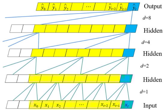 Temporal convolutional network (TCN) is an algorithm that can be used to solve time series predictions. At the same time, TCN also provides a unified method to capture spatiotemporal information hierarchically. These layers have time attributes and are used to learn global and local patterns in data. Its main features are: (1) Since each prediction can only rely on its previous prediction TCN, using causal convolution, will not have data leakage; (2) TCN combines the deep neural network and extended convolution to form a model that can save a long effective history. When the model is used for multi-dimensional data parallel input, it can maintain efficient computing efficiency [35]; (3) TCN also introduces residual network and hole convolution to construct long-term dependence, so as to effectively improve the performance of the model. The TCN model structure is shown in Figure 1. The hole coefficient at the lowest layer of the hidden layer is d = 1, which means that samples are taken at each time point during input. The next layer d = 2 means that every two time points are taken as an input, and so on. In Figure 1, the third layer is taken as an example. The convolution kernel size k = 3, and the expansion convolution calculation formula is: