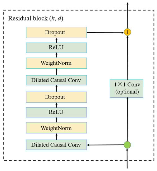 Figure 2 shows the residual network structure. Dropout means that during the neuron propagation process, the activation value of a neuron stops working with a certain probability to enhance the generalization of the model. ReLU represents the linear rectification function, which is used as the activation function of the neural network. Weight Norm means to normalize the weight value, and Dilated Causal Conv represents a dilated convolutional layer.
