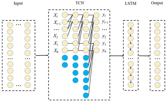 In short-term passenger flow prediction, the change of passenger flow has multiple complex characteristics, such as strong nonlinearity, weak periodicity, and correlation. A single passenger flow prediction model cannot fully capture each feature of the data. However, the combined model can alleviate this problem to a certain extent [37]. In this paper, combining the temporal convolutional network (TCN) model with the long short-term memory network (LSTM) model, a deep learning-based TCN-LSTM model is established to predict the short-term passenger flow of URT. The model structure is shown in Figure 5. The specific workflow is: first, feature extraction is performed; the parameters in each layer are normalized, and the feature data are transmitted to the TCN layer for convolution calculation. Then, the TCN layer obtains more complete sequence features through dilated convolution and causal convolution calculations, so as to extract more dilated information dependencies. Finally, the output of the TCN layer is used as the input of the LSTM network layer to further extract features while retaining the features extracted in the TCN and then merged with the features captured by the LSTM network layer. In this way, the short-term trend of passenger flow data can be captured, and the prediction results of the combined model can be obtained.