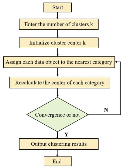 The spatial distribution characteristics of passenger flow are related to the location of stations. Based on the above daily average passenger flow data of some stations of Chongqing Rail Transit Line 3, the K-means clustering algorithm [38] is used to cluster the passenger flow of stations and determine the classification standards of passenger flow of different stations, to provide a guidance for subsequent passenger flow prediction. The K-means algorithm is an iterative clustering analysis algorithm. By updating the values of each clustering center, the samples can be clustered through this algorithm, and the samples with similar characteristics can be clustered into a class. The process is shown in Figure 6 and algorithm steps are as follows: