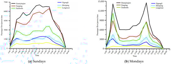 The temporal distribution characteristics of passenger flow have regular changes in the morning and evening peak due to the impact of residents’ commuting and school hours. For different stations, the morning and evening peak hours may be different. Taking the daily average station passenger flow of April 18 (Sunday) and April 19 (Monday) in 2021 as an example, the temporal distribution characteristics of high, medium (select 2 stations), and low (select 3 stations) passenger flow stations are analyzed, as shown in Figure 8.