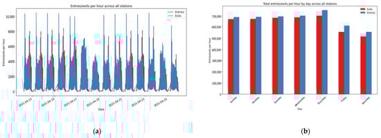 Influence of date attribute on URT passenger flow. (a) Daily inbound/outbound passenger flow statistics; (b) Statistics of daily average inbound/outbound passenger flow within a week.