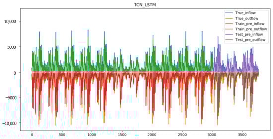 Using the TCN-LSTM combination model to analyze and predict the above passenger flow data, the loss value curves of the training set and test set are shown in Figure 11. It can be seen that both curves drop to a stable value, indicating that the trained network behaves normally. The total passenger flow prediction results are shown in Figure 12. It can be seen that the TCN-LSTM model can approximately capture the changing characteristics of the real URT passenger flow to a certain extent and can reflect the law of short-term traffic passenger flow changing with time. At the same time, to compare and verify the accuracy of the TCN-LSTM model, this paper also established a single LSTM model to predict the passenger flow, as shown in Figure 13.