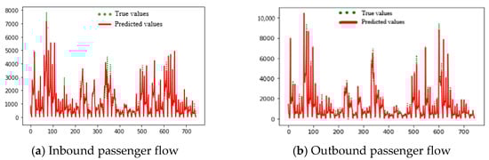 The method described in Section 4.3 is used to preprocess the raw data and encode date attributes and weather factors. The time period 6:00–23:00 is selected as the target time period for passenger flow research, and 1 h as the time slice, i.e., passenger flow is counted every 1 h. The experimental running environment of this paper is python3.10, and the short-term passenger flow prediction model is built by the third-party libraries of Scikit-learn, Keras, and TensorFlow in python.