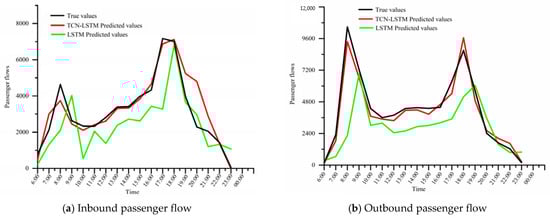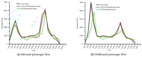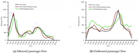 To more intuitively demonstrate the ability of the TCN-LSTM model to capture the passenger flow characteristics, the prediction of inbound/outbound passenger flow in different time segments of rail transit was analyzed for specific high, medium, and low passenger flow stations. The prediction results of the single LSTM model were compared as shown in Figure 14, Figure 15 and Figure 16. It can be seen that the prediction performance of the LSTM single model is poor, and the prediction error of the peak passenger flow is large. The prediction results of the two models show that the TCN-LSTM model is superior to the single LSTM model both in the short-term passenger flow prediction and data generalization of URT.
