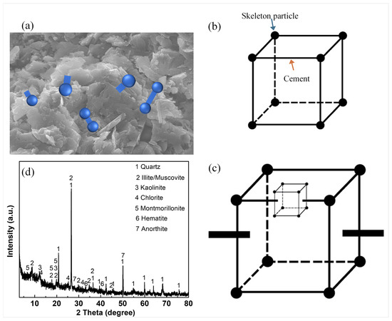 Microstructure and renormalization model of soft rock: (a) silty mudstone microstructure, (b) renormalized model unit of soft rock, (c) renormalization model of soft rock, (d) the XRD chart of soft rock.