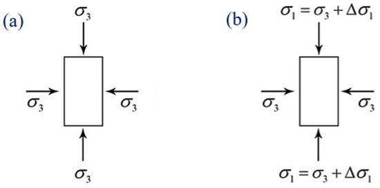 Stress state of triaxial compression: (a) the initial state upon adding confining pressure; (b) the stress state after axial pressure is applied.