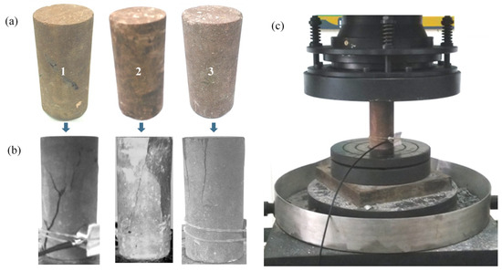 The rock sample used is typical of red-bed soft rock: silty mudstone, purplish-red in color, argillaceous and calcareous in cementation, as shown in Figure 2a. In general, the clay minerals of such soft rocks are mainly illite and kaolinite and the XRD chart is shown in Figure 2d. The samples were prepared into cylinders with a diameter φ of 50 mm and a height H of 100 mm. There were three samples in total, as shown in Figure 5a. The test was performed according to ASTM standards [48].