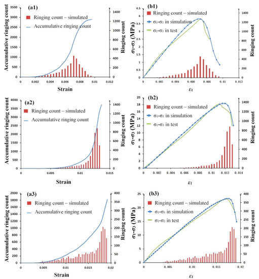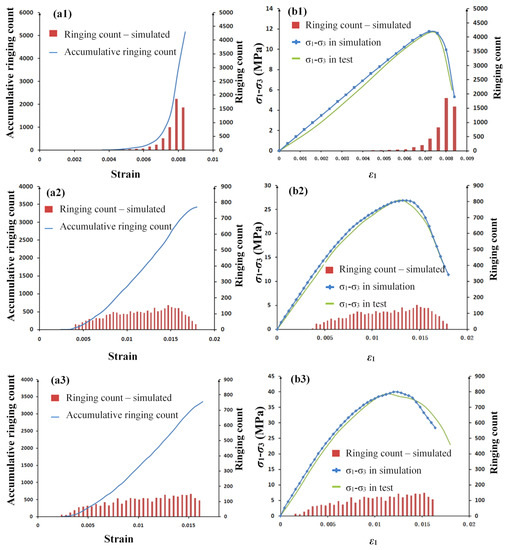 Damage characteristics and stress–strain relationships of red-bed soft rock in uniaxial compression numerical tests. (a1) Accumulative ringing count (No. 1 rock sample); (a2) Accumulative ringing count (No. 2 rock sample); (a3) Accumulative ringing count (No. 3 rock sample); (b1) Stress (No. 1 rock sample); (b2) Stress (No. 2 rock sample); (b3) Stress (No. 3 rock sample).