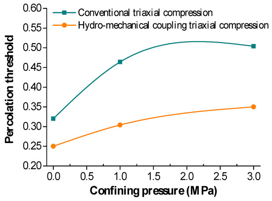 According to the theory outlined in Section 2.2 and Section 2.3.2 and the numerical simulation data in Section 3.3, the percolation threshold of red-bed soft rock under the conventional triaxial compression test can be calculated, as shown in Table 4. This table shows that when the confining pressure is 0, the percolation threshold is 0.32; when confining pressure rises to 1 MPa, the percolation threshold rises to 0.464 (an increase of 0.144); when the confining pressure rises to 3 MPa, the percolation threshold continues to rise to 0.504 (an increase of 0.04). When the confining pressure increases from 0 to 1mpa, the threshold increases by 45%. When the confining pressure increases from 1 MPa to 3 MPa, the threshold increases by only 8.6%. It can be seen that the percolation threshold increasing speed decreases with the confining pressure increase, as shown in Figure 12. When there is no confining pressure, the soft rock as a whole will be destroyed when one-third of the cement inside is damaged. However, when there is confining pressure and when one-third of the cement inside the soft rock is damaged, the strength from the confining pressure means that the soft rock is not destroyed but continues to be damaged. On the other hand, with increase in confining pressure, the strain at which soft rock failure occurs also increases, as shown in Table 4. This pattern indicates that the ductility of the soft rock improves; that is, the degree of damage can be greater and the percolation threshold increased.