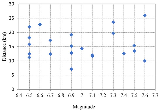 The first step in the process of evaluating the performance of IDA curves is to prepare a set of earthquake ground motions, which indicate the seismicity of the area. In fact, if a sufficient number of seismic accelerometers have been recorded in the area in question, those will be used; otherwise, similar ones from the PEER website can be utilised. Therefore, in the first step, records should be selected in accordance with the almost similar conditions of the region in terms of fault mechanism, distance from the desired site and the magnitude of the earthquake. Due to the shortcomings in the accelerometers recorded in Iran, and ambiguities being ambiguities in their accuracy, in order to reduce the number of errors in this study, a selection of the selection of accelerometers from 15 accelerometers of the recommended records FEMA-P695 [31] has been used, as mentioned in the reference. The specifications of these accelerometers are also summarized in the table below. It should be noted that, in this paper, each of these 15 accelerometers has been scaled according to the spectral acceleration of each at 5% damping and the period mode cycle of the structure Sa (0.05, T1). For this purpose, Seismosignal and Excel software have been used in this article. In this way, first, the spectral acceleration of each record is brought to 1 and then according to the modeling and analysis file of each system, each of the selected records is from 0.1 g to the limit of structural failure (which here is approximately 1.5 g). Table 3 shows the specifications of the used ground motions. Figure 12 and Figure 13 show the large-distance distance diagram and the average response spectrum of selected ground motions, respectively.