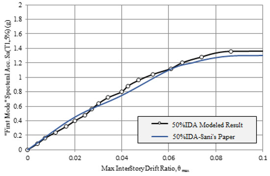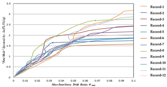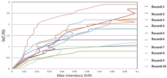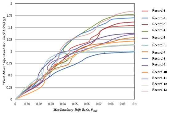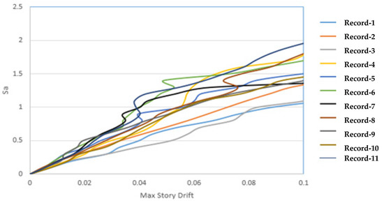 As mentioned, the selected frames of the analyzed structures were modeled in two dimensions in OpenSees software and the general outline of the modeled frames is given in the following figures. The response of an earthquake structure can be estimated with appropriate accuracy by performing dynamic analysis of time history. One of the most important drawbacks of applying nonlinear dynamic analysis is the sensitivity of the response to selected accelerometers. The presentation of incremental dynamic analysis and estimation of responses based on the application of probabilistic relations has to a large extent compensated for this weakness in practice. The results of IDA analysis and comparison of their means of 50% for all frames are shown in Figure 14, Figure 15, Figure 16, Figure 17, Figure 18, Figure 19, Figure 20 and Figure 21.