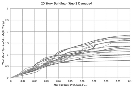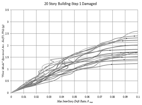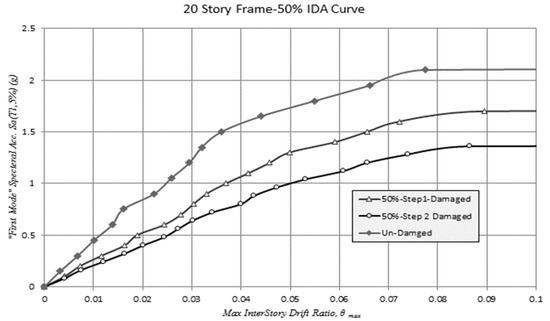 IDA curves obtained for a slightly damaged 20-story frame (by removing one beam and one column on the tenth floor in addition to removing one beam and one column on the fifth floor).