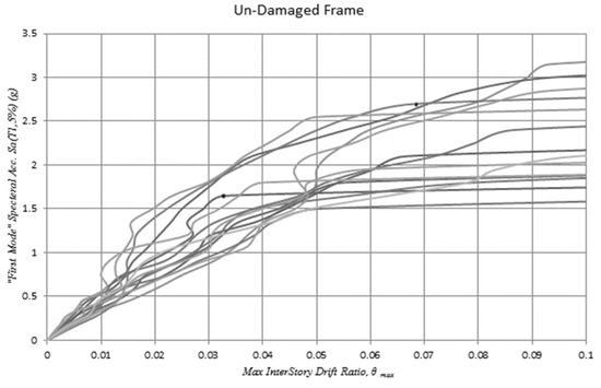 IDA curves obtained for a slightly damaged 20-story frame (by removing a beam and a column on the fifth floor).