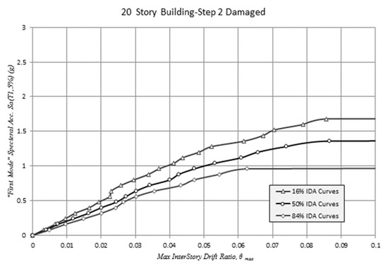 Curves of 16%, 50%, and 84% for IDA curves obtained for a slightly damaged 20-story frame (by removing one beam and one column on the tenth floor in addition to removing one beam and one column on the fifth floor).