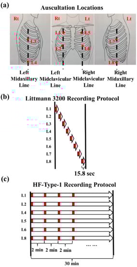 We used two different devices to record the participants’ lung sounds. The first device was a commercial handheld electronic stethoscope, Littmann 3200 (3M, Saint Paul, MN, USA); the second one was a customized auscultation device, HF-Type-1 [18], which supported multichannel continuous sound recording through attachable acoustic sensors. We followed the same recording protocols described in our previous study to acquire the lung sounds from the participants [18]. Eight auscultation locations (Figure 1a) were firstly defined—L1: second intercostal space (ICS) on the right midclavicular line (MCL); L2: fifth ICS on the right MCL; L3: fourth ICS on the right midaxillary line (MAL); L4: tenth ICS on the right MAL; L5: second ICS on the left MCL; L6: fifth ICS on the left MCL; L7: fourth ICS on the left MAL; and L8: tenth ICS on the left MAL. Briefly, when the Littmann 3200 device was used, to complete a standard round of recording, lung sounds must be auscultated sequentially from L1 to L8 (white arrows in the top graph in Figure 1b). When the HF-Type-1 device was used, acoustic sensors were attached at L1, L2, L4, L5, L6, and L8, and lung sounds were continuously recorded at the same time. A standard round of lung sound recording with the HF-Type-1 device consisted of the acquisition of continuous signals from each of these six locations over 30 min (white arrows in the bottom graph in Figure 1b).