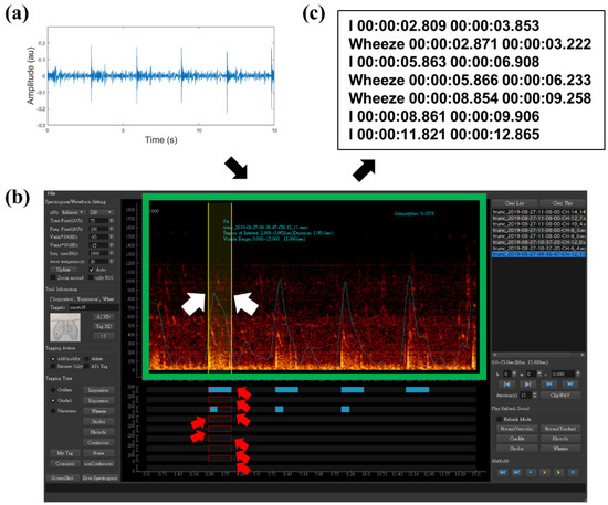 Labeling process. (a) Raw signal of a lung sound recording. (b) Labeling software. (c) Output in a label file. In (b), the green square represents the spectrogram, the yellow lines indicated by the white arrows represent the boundaries of an ROI (the transparent yellow patch), and the red arrows indicate areas on different label tracks of which start and end times bounded by the ROI; when a labeler clicks on one of them, a corresponding label is generated.
