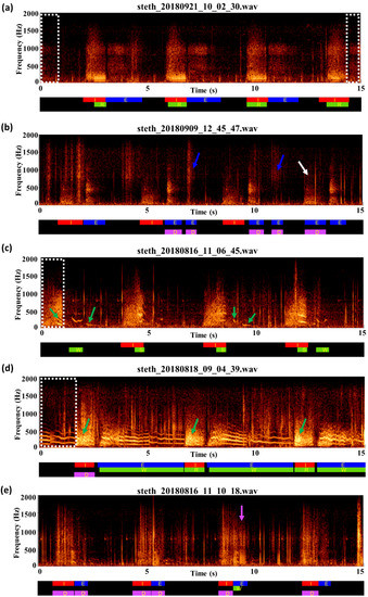 However, the quality of C labels was unsatisfactory. CASs were often found unlabeled, such as the ones (green arrows) in Figure 7c. In some cases, the labelers were unsure whether to label a borderline case. For example, the labeler did not label the sound indicated by the first green arrow in Figure 7d but labeled the sounds indicated by the second and third green arrows although these sounds did not form clear streak patterns on the spectrogram.