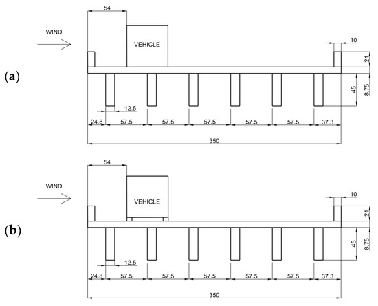 TFFS models (all dimensions in mm): (a) van model without wheels (model A) and (b) van model with wheels (model B); in both configurations, van models are placed on a 1 m long bridge-deck section model; adapted from Kozmar et al. [5].