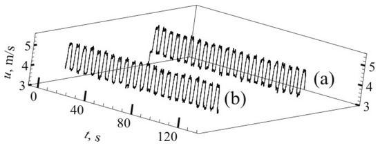 Example records of the experimental velocity time series, simulating periodic features of the bora wind, are presented in Figure 2.